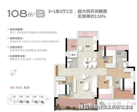 约108㎡主力户型:实现四开间朝南,三间卧室均朝南,主卧套房独占东南单边位,采光通风俱佳,堪称同面积段中的“天花板”。