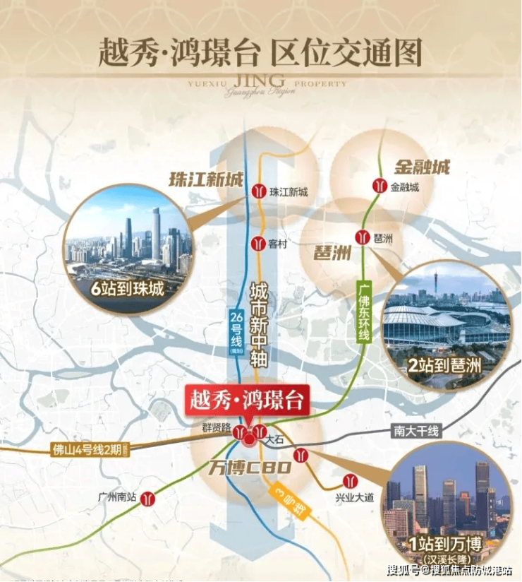 越秀鸿璟台雄踞广州城市发展主轴——南大干线北侧,地处番禺大石核心腹地,精准卡位“珠江新城—万博”双CBD黄金走廊。项目坐拥3地铁+1城际+2快速路的立体交通网络:步行即达地铁3号线大石站,1站直达万博枢纽(汉溪长隆站),6站直抵珠江新城;广佛环线(在建)、南大干线、新光快速等多维路网交织,30分钟畅达全城核心商务区。