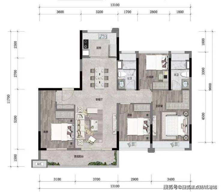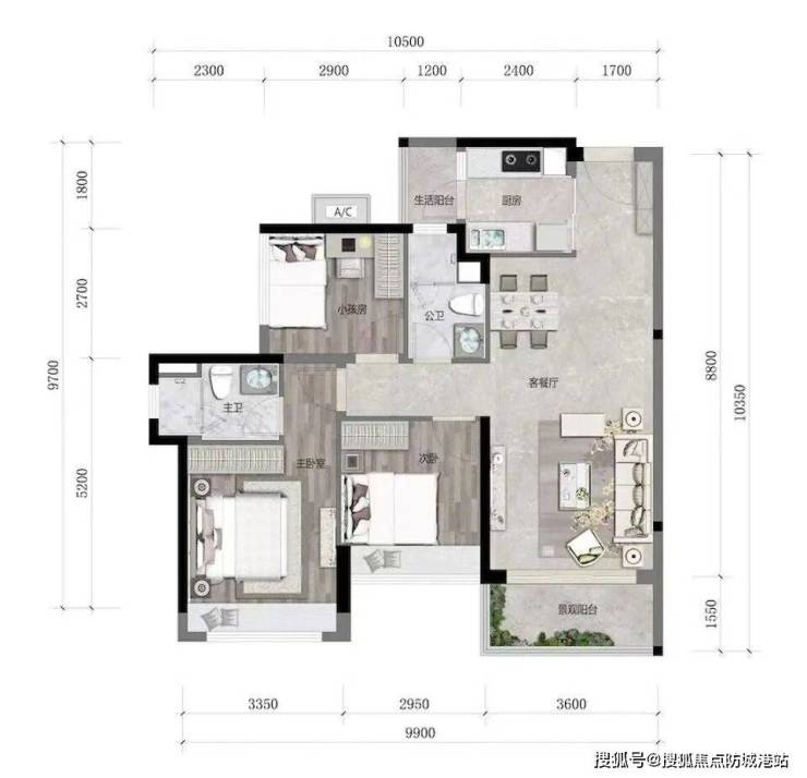 3房南北对流双阳台设计,房间和客厅、餐厅的尺度均匀,没有厚此薄彼。