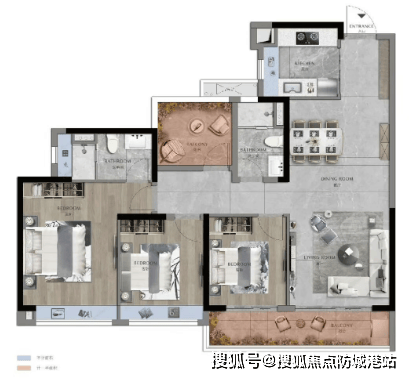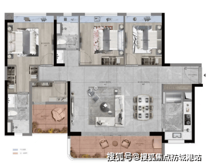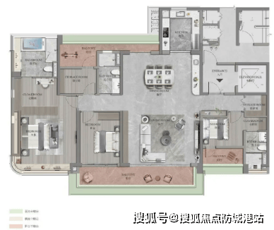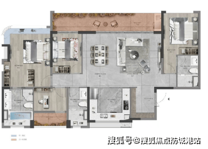 210 平米四房两厅三卫户型,是二期的顶级江景户型,拥有更开阔的江景视野和更奢华的居住体验。该户型的客厅开间达到了 5.5 米,与一个 9 米长的超大观景阳台相连,270 度环幕江景,推窗即可欣赏到珠江的无限风光。主卧套房面积约 35 平米,带独立的衣帽间、卫生间和书房,卫生间内预留了浴缸和双台盆的位置,尽显奢华。此外,该户型还拥有独立的家政间和入户玄关,功能分区更加清晰,居住舒适度更高。家政间面积约 5 平米,能够放置洗衣机、烘干机等家电,方便业主打理家务。