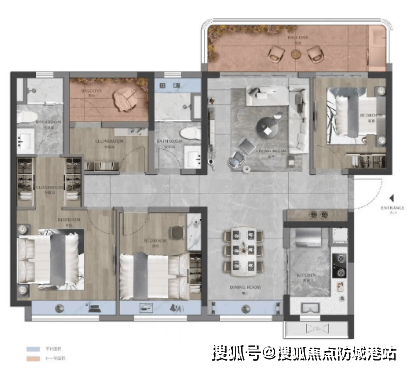 135 平米四房两厅两卫户型,适合三代同堂或者二胎家庭,该户型四开间朝南,采光充足,客厅开间 4.2 米,与一个 4.2 米长的观景阳台相连,视野开阔。四个卧室的面积都在 10.5 平米以上,最小的卧室也有 10.5 平米,能够满足不同家庭成员的居住需求。主卧套房面积约 24 平米,带独立的卫生间和衣帽间,舒适度高。该户型的功能分区非常清晰,客厅、餐厅、厨房、卧室、卫生间等空间相互独立,互不干扰,居住体验非常好。