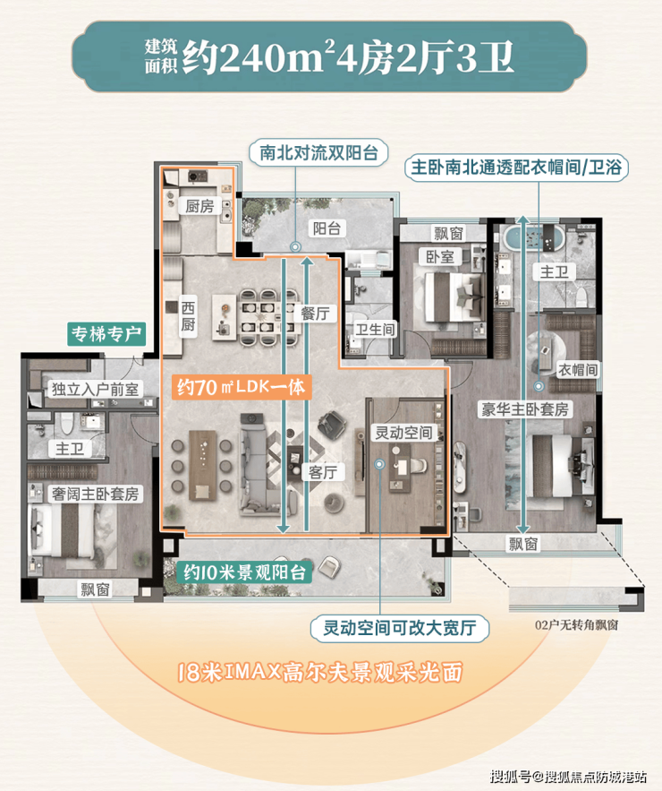 建面约 240㎡大平层产品,4 房 2 厅 3 卫格局,广佛高端人居的标杆之作