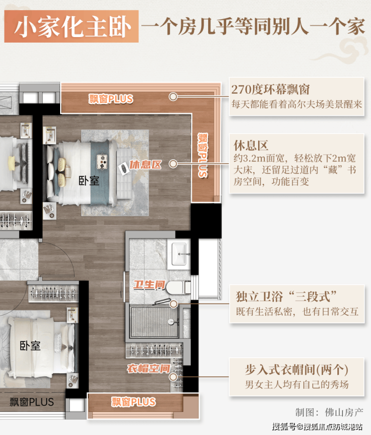 建面约 143㎡户型的主卧套房,更是将高端改善的居住体验做到了极致,整个主卧套房的面积达到了约 25㎡,采用了双动线、三面采光的设计,搭配 270° 环幕巨幅飘窗,真正实现了 “主卧小家化”,把一个家的所有功能,都浓缩在了这个主卧套房里,给主人带来了极致私密、极致舒适的居住体验。