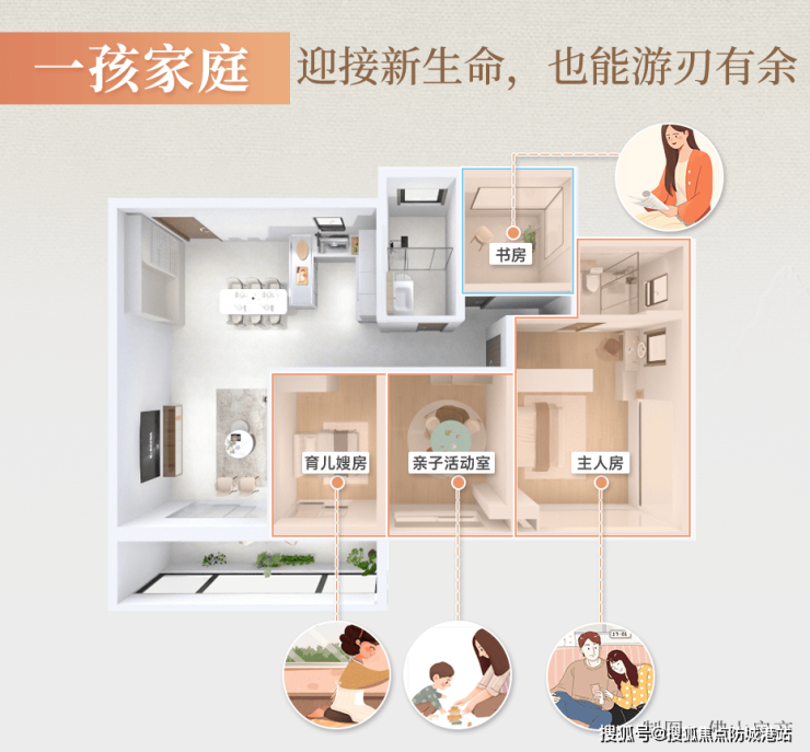 当家庭迎来新生命,进入三口之家的阶段,这套房子也能轻松应对。你们可以把其中一间卧室打造成儿童房,给孩子一个专属的成长空间;一间可以做亲子互动室,陪伴孩子玩耍、阅读、做手工,见证孩子的成长;灵动空间可以作为育儿嫂的房间,或者是母婴室,在新手爸妈最手忙脚乱的阶段,给你们充足的空间支持,让你们既能照顾好孩子,也能保留自己的生活空间与兴趣爱好,不会因为孩子的到来,让自己的生活变得一团糟。