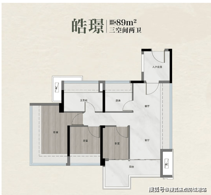建面约89㎡三房两厅一卫: 入门级产品实现“三房”功能,户型方正,动静分区,满足刚需家庭一步到位的需求。