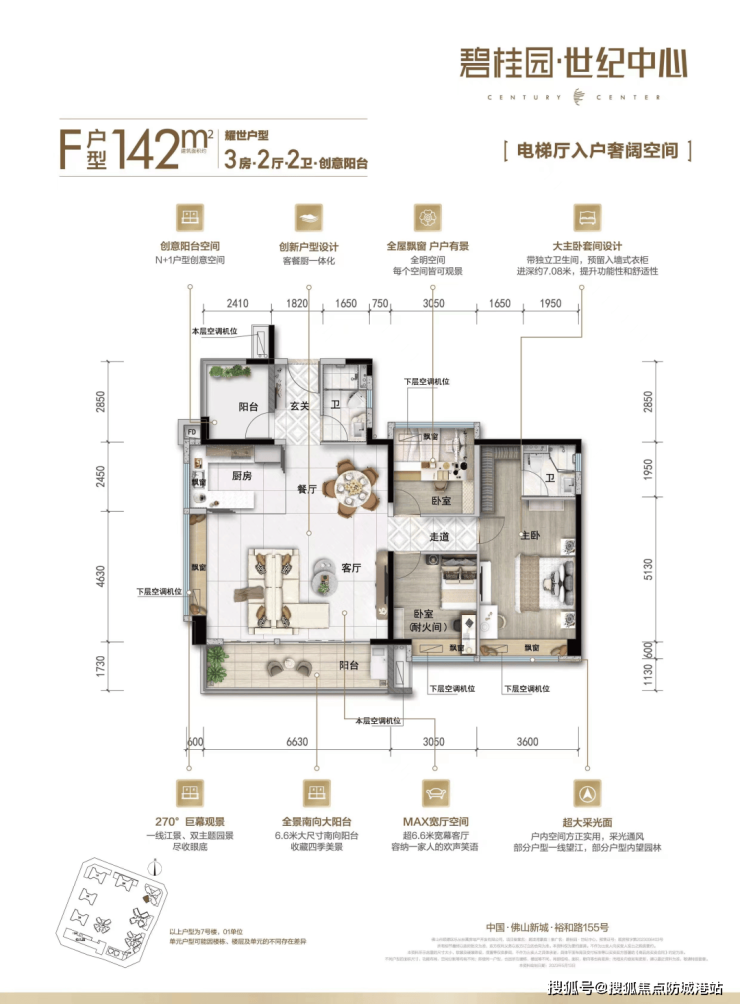 - **143㎡耀世户型**:LDKG客餐厨阳台一体化设计,空间通透开阔,方便家庭成员互动交流。超尺度家庭厅适合社交、聚会、亲子活动。约270度超面屏观景视野,带来极致观景体验。超约6米双开间景观南向阳台,视野更开阔。全屋全景飘窗设计,增加室内空间感与采光。