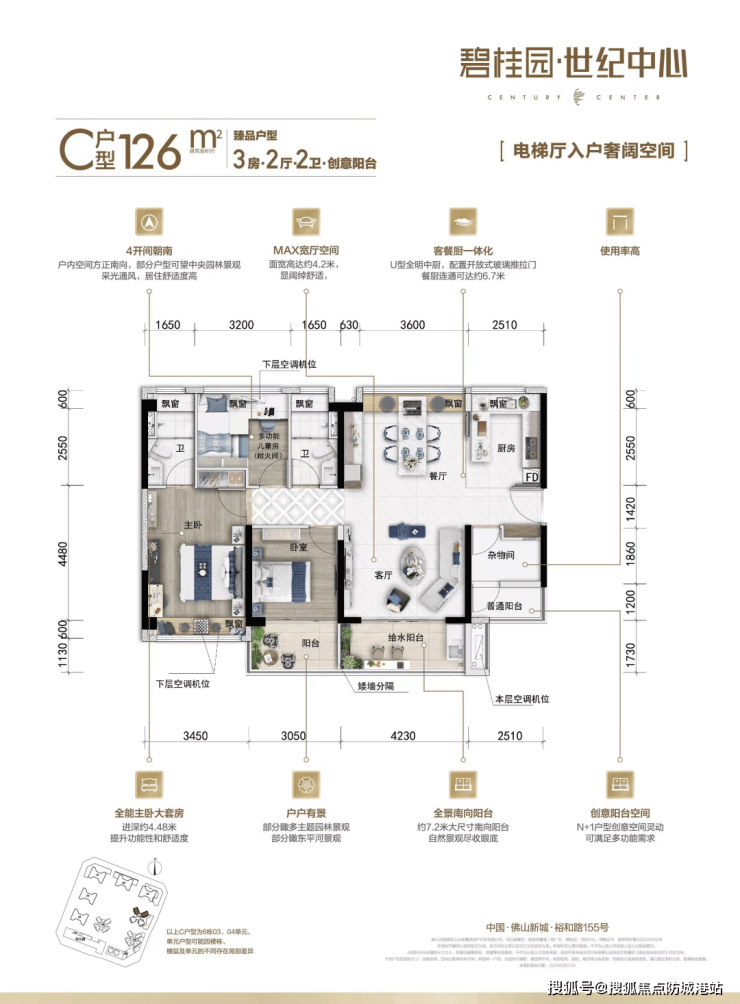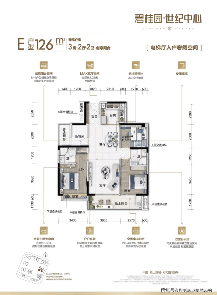 - **126㎡臻品户型**:创意阳台搭配N + 1灵动空间,为家庭生活增添更多可能性。社交、聚会、亲子的超尺度家庭厅,满足家庭各种活动需求。约8.23米MAX超大采光面宽,让阳光充分洒入室内。超约6.4米景观南向阳台,可尽情欣赏室外美景。