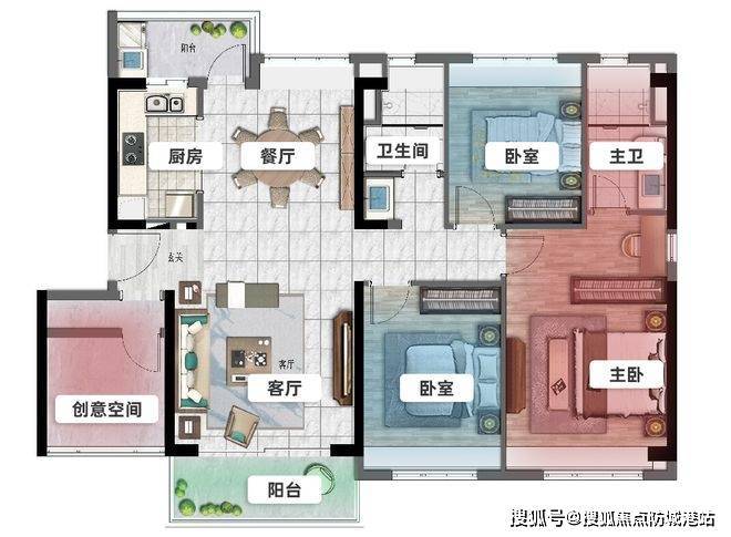 户型设计独具匠心,得房率有优势。建面约 116㎡复式户型,巧妙咬合结构下有约 15㎡拓展空间,相当于多出近 70 万价值空间(按番禺一手均价算)。双阳台配置,南北通透。上下分层设计,兼顾家庭团聚与个人私密空间。