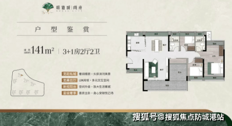建面约 141㎡奢阔四房,是城市高阶人群的专属定制,尽显改善大宅的奢阔与尊崇。约 7 米超宽景观阳台,宛如空中花园,无论是莳花弄草、品茶观景,还是健身休闲,都能尽情享受;东、南、北三面全景飘窗,实现 360° 无死角采光观景,清晨被阳光与美景唤醒,夜晚枕着星光入眠。主卧采用豪华套房设计,配套独立卫浴、衣帽间,空间宽敞私密,满足主人对品质生活的极致追求;全屋动静分区明确,公共区域热闹温馨,私密区域安静舒适,兼顾生活社交与居家休憩。