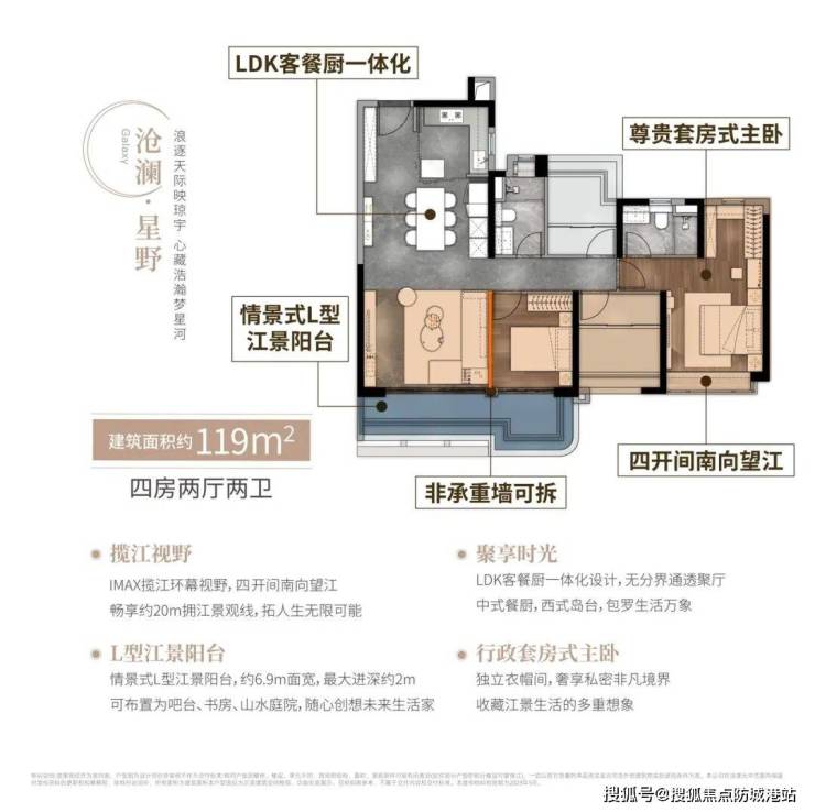 119㎡四房:270°环幕视野,四开间朝南望江,L形阳台面宽达6.9米,主卧配备独立衣帽间,尽显改善格调;