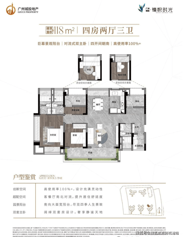 约 118㎡户型(四房两厅三卫):拥有巨幕景观阳台,采用对流式双主卧设计,四开间朝南,使用率超 100%。客餐厅南北对流,居住舒适度高,还有阔绰双套房设计,为业主提供奢享静谧的居住空间。