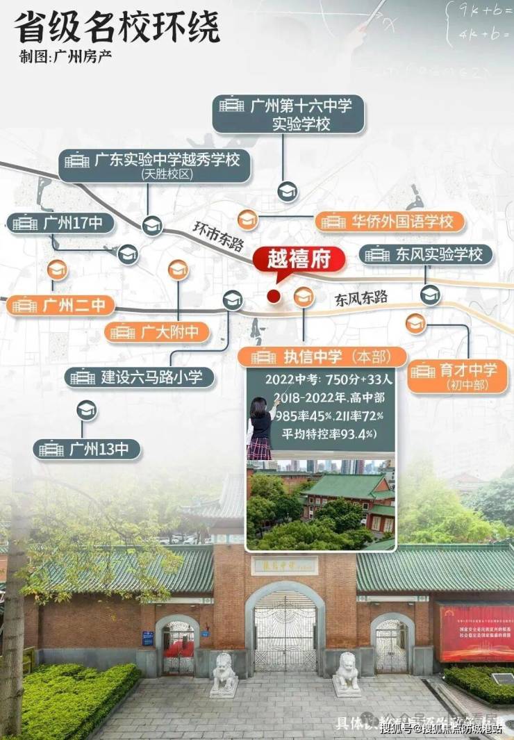 而在小升初阶段,根据越秀区往年的小升初报读指南参考,项目所在的片区,小升初摇号对位共计 10 所中学,其中包含 6 所省级名校,分别为执信中学本部、育才中学、华侨外国语学校、广州市第二中学、广东广雅中学、广州市第十六中学。这其中,执信中学本部作为广州百年名校,是广东省首批国家级示范性高中,其高中部的重本率常年保持在 99%,高考 600 分以上的学生占比达到 86%,教学实力稳居广州全市前列,是无数家长和学子心中的理想学府。