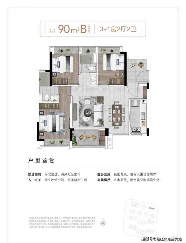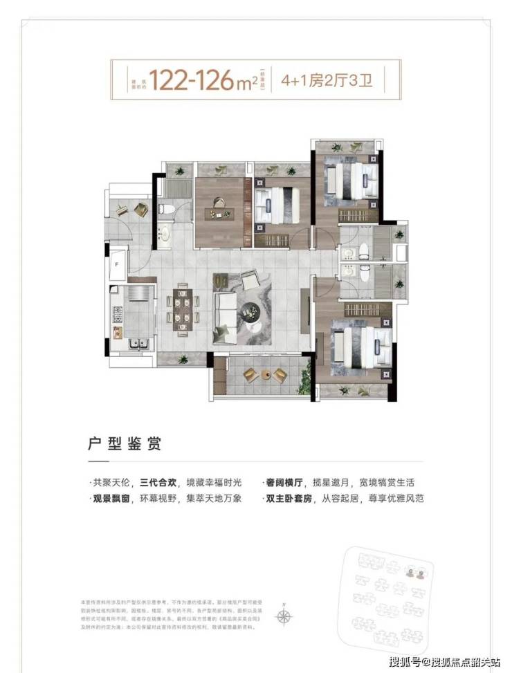 126㎡4+1房:双主套+5.7米观景阳台,全屋11个采光面。