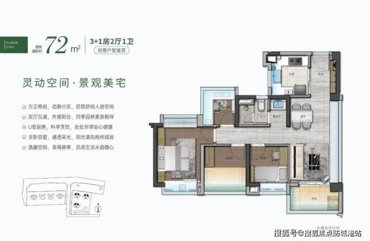 主力户型72平方米做到四房两厅一卫,主卧进深达3.6米