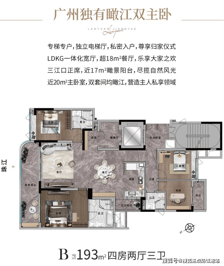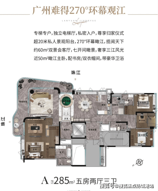 193㎡江景大宅:南北通透,拥有L型一线珠江曲线阳台,享受无敌江景视野。