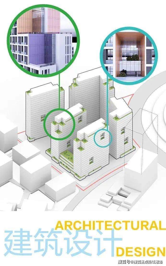 通过对裙楼凹凸退进、塔楼局部楼层内凹、塔楼顶部退台等设计的方式,形成错层空间 ,实现对应楼层露台、阳台、通高等空间丰富立面造型。