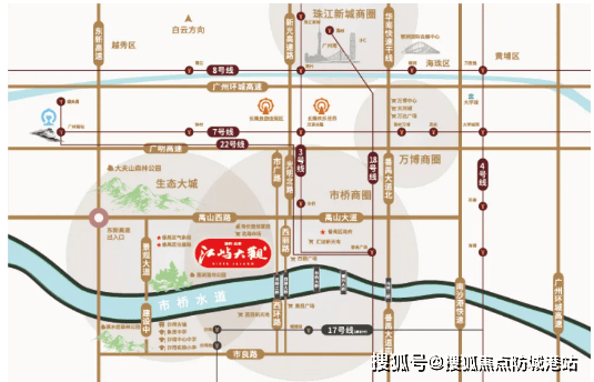 其中,距离3号线市桥站约1.2公里,步行15分钟可达,乘坐3号线可直达天河、越秀等主城区,通勤便捷;距离18号线番禺广场站约2公里,驾车5分钟可达,18号线为快速地铁,30分钟可达珠江新城、琶洲CBD,满足商务办公通勤需求;22号线通车后,将进一步缩短与荔湾、南沙的距离,实现大湾区快速互通。