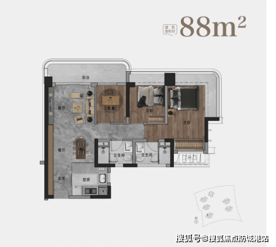 88㎡户型:该户型为三房两厅两卫设计,布局紧凑实用,空间利用率高。配备约5.7M巨幕阳台,采光通风效果极佳,同时能欣赏到社区园林美景;270°环幕瞰景主卧,配备独立卫生间,私密性强,且拥有广阔的观景视野;采用LDKB一体化设计,将客厅、餐厅、厨房、阳台连通,打造开阔的公共活动空间,方便家人交流与日常活动。