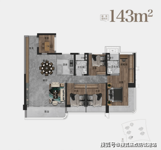 143㎡户型:四房两厅三卫设计,终极改善型户型,空间奢华宽敞。采用南向宽景4开间设计,全南向采光,室内明亮通透;约36.5M环幕采光面,最大化提升采光与观景效果,让业主在家就能享受全方位的美景;270°环幕瞰景主卧,空间极致宽敞,配备独立卫生间、衣帽间与观景飘窗,尊享顶级居住体验;多元化功能阳台,满足家庭多种使用需求,进一步提升居住品质。
