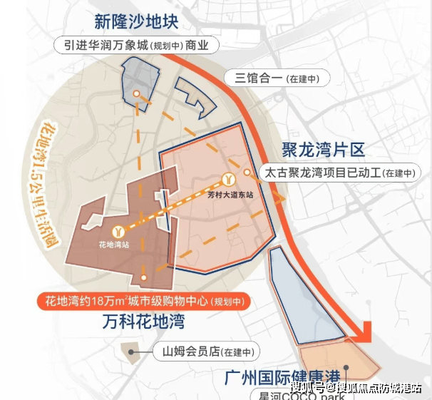 万汇天地·朗庭雄踞花地湾商务组团核心腹地,半径约2公里范围内,精准锚定白鹅潭核心区、聚龙湾组团与花地湾组团——这三大引擎共同构成珠江西岸中央活力区(CAZ)的“黄金三角”。项目不仅紧邻规划中的双太古商业地标,更与26.9万㎡华润万象城(在建)、18万㎡理想花地购物中心(规划中)形成商业共振,未来将汇聚超百万方世界级商业体量,真正实现“下楼即入世界级商圈”。