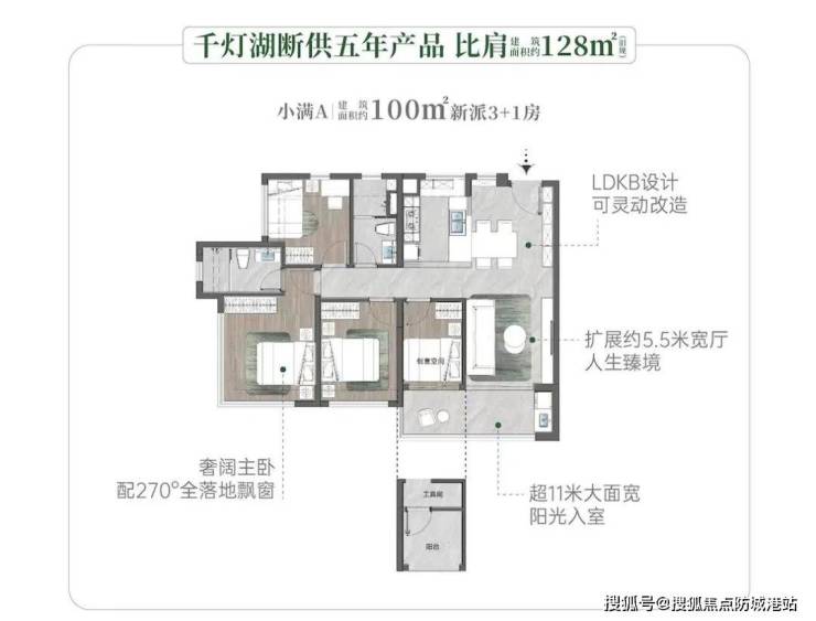 该户型类似保利琅悦100㎡四房的设计,实用率超100%,做到四开间朝南,餐客厅还能做到南北对流。