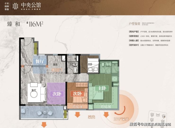 116平方米户型:户户东南,近14米南向采光面,超6米宽景阳台,主套270°飘窗设计。