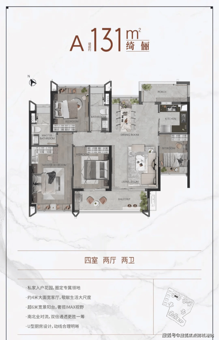 高端改善可选131㎡四房两厅两卫户型,总价500-520万元,均采用南北对流设计,居住舒适度拉满。A户型主阳台朝南,三个卧室均朝南,最大限度享受阳光与温暖,居住体验极佳,仅望花园景观有轻微遮挡;B户型主阳台朝北,可直接眺望海珠国家湿地公园,推窗即揽生态盛景,两个卧室朝南、两个朝北,兼顾采光与景观,适合追求居住品质与景观体验的家庭。