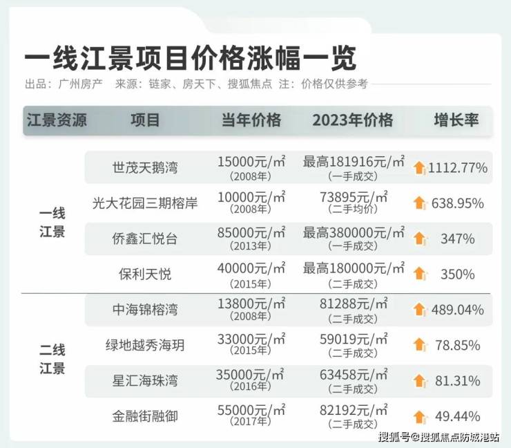据统计,2013年至今,广州仅出让9宗临江地块,稀缺程度可想而知,江景豪宅最高涨幅高达1112%。