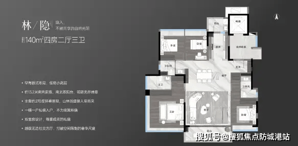 小高层建面约 143㎡四房:为成交主力户型,已售 45 套,去化率达 88%,该户型南北通透、湖景视野好,适合三口之家、四口之家的改善型需求;