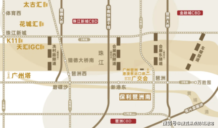 项目距离地铁8号线与11号线交汇的琶洲站约900米,步行10分钟左右。早高峰打车到珠江新城CBD平均25分钟,通勤效率在琶洲片区里算得上友好。更关键的是,随着车陂南隧道通车、琶鱼隧道开工,以及11号线环线贯通,琶洲南与金融城、鱼珠的连接正变得越来越紧密,不再是“孤岛式”开发。