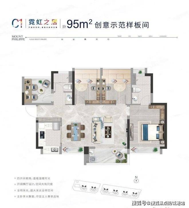 住宅户型设计科学合理,二房、三房及四房布局充分考虑空间通透性与生活动线,南北向采光充足,客厅与卧室相互独立,保障居住舒适性。主卧配备套间及飘窗设计,增加居住舒适感及采光效果。