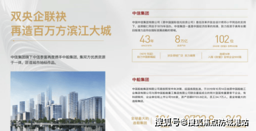 广州滨江天地由中信泰富地产与中船集团联手打造。中船集团作为全球最大的造船集团,在世界500强中位居第240位,拥有雄厚的实力与丰富的资源。中信泰富作为中信集团(世界500强企业位居115位,总资产值高达8万亿元)全资子公司,旗下最大的实业板块,同样具备卓越的开发能力与品牌影响力。二者强强联合,旨在打造一个约125万方的多元复合综合大城,涵盖住宅、商业、教育、文化等多种业态。这种大规模、综合性的规划,不仅是对江岸空间的重塑,更是将江岸资源汇聚成城市资产的大胆尝试,为广州带来一座集多种功能于一体的滨江地标项目。