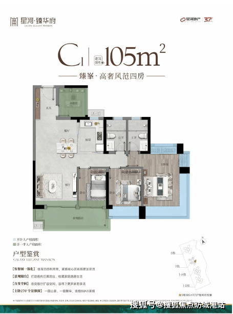 约125㎡四室:分布在9号楼,迎宾入户花园,宽幕景观阳台,270°瞰景飘窗主卧。