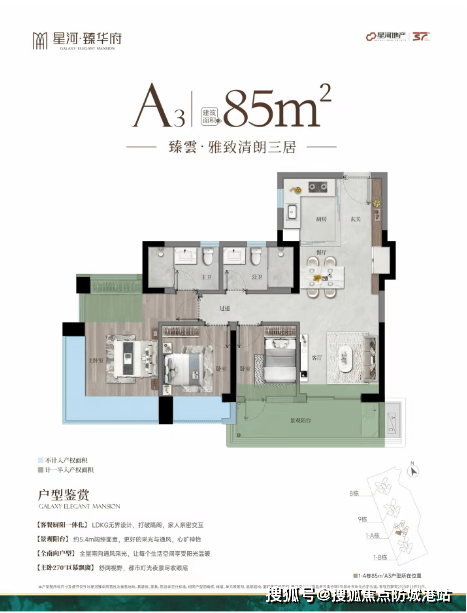 约85㎡三房:分布在1号楼,客厅+三个卧室均朝南,通透起居空间。
