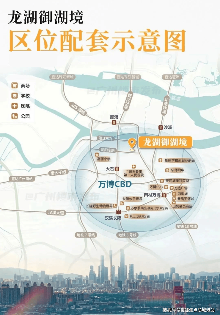 龙湖御湖境周边商业配套丰富,车行7分钟即可到达万博商圈,20分钟内可达珠江新城商圈及琶洲-广州塔商圈。这些商圈内汇聚了天河城、K11、四海城等十大旗舰商业体,为居民提供了便利的购物和娱乐体验。