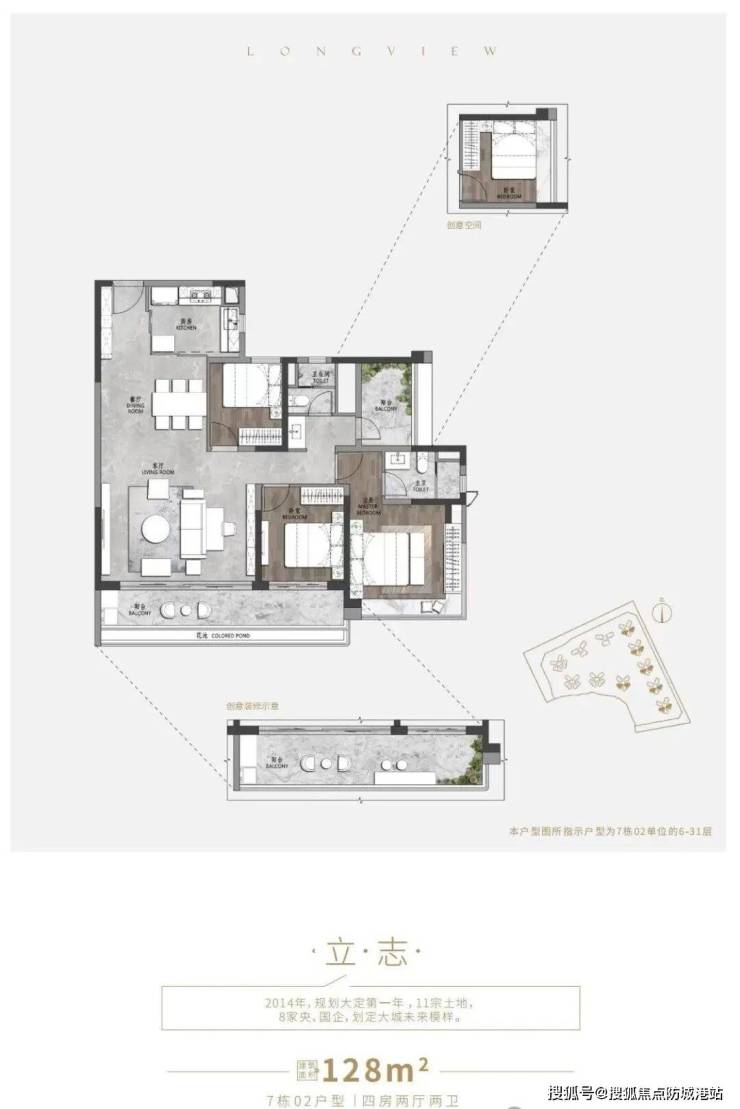 我重点看了98㎡的三房两厅两卫。这个户型最打动我的,是它做到了三开间朝南——客厅加两个卧室全部向阳,在98㎡段位里并不多见。厨房与客厅之间用透明玻璃隔断,做饭时能看见家人活动,既保持互动又避免油烟扩散。阳台连通次卧,形成一个近6米的横向观景面;主卧L型飘窗进深约0.6米,摆个小茶几完全没问题。而128㎡四房则把“空间弹性”玩明白了:7.9米阳台不只是晾衣服的地方,完全可以打造成迷你花园或晨读角;客厅开间5.3米,未来孩子长大,中间加个隔断就能变成独立学习区。所有户型都利用报建规则做了花池、阳台等赠送设计,实际使用面积比建筑面积多出不少。
