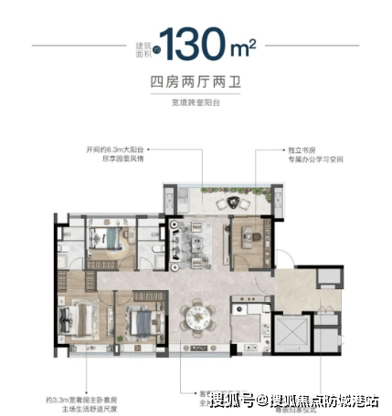 阔绰电梯前厅,给予您尊崇的归家仪式感;客餐厅双面采光,全屋南北通透,让阳光与清风肆意穿梭;开间约 6.3 米大阳台,可尽享园景风情;超奢阔主卧套房,感受生活的舒适尺度;独立书房,为您打造专属办公学习空间,满足您对品质生活的追求。