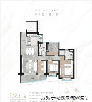 135㎡ | 王牌东南向四房:此户型面积适中,东南朝向,采光良好,适合改善型家庭。主卧带有独立卫生间和衣帽间,提升了居住的私密性和舒适度。