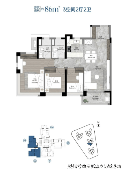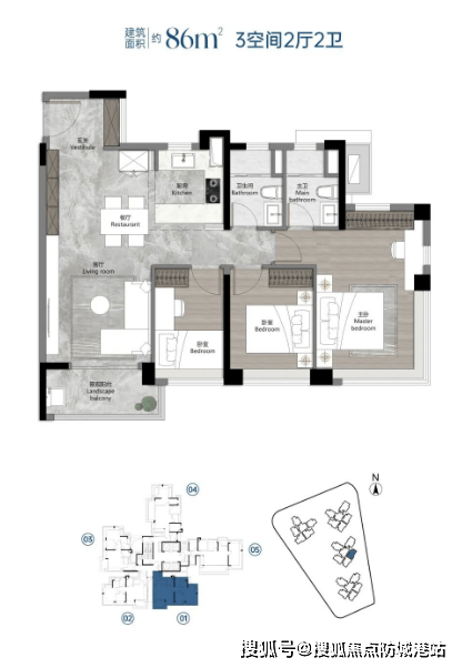 88㎡三房两卫:四开间朝南,赠送空间达到极致,相当于旧规110㎡的尺度感。