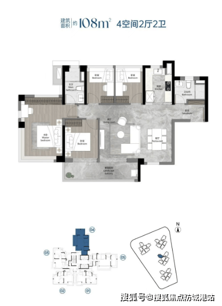 108㎡四房:阳台开间5.95米,客厅+三个卧室均为南向,居住舒适度极高。