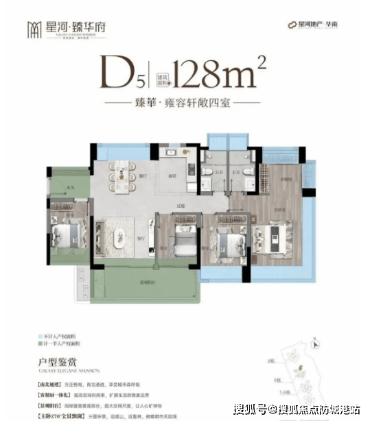 臻華·建面约128㎡雍容轩敞四室,主打高端改善,适配三代同堂或对居住品质有较高要求的进阶家庭。该户型使用率接近100%,空间宽敞开阔,雍容大气;迎宾入户花园设计,既增加了储物空间,又能作为入户缓冲区域,彰显品质感与私密性;宽幕景观阳台,视野开阔,可俯瞰社区园林与外部生态景观,兼具休闲与储物功能;270°瞰景飘窗主卧,自带独立卫浴、衣帽间,空间宽敞舒适,保障业主私密空间,同时适配三代同堂的居住需求,让每一位家人都能拥有专属舒适空间。