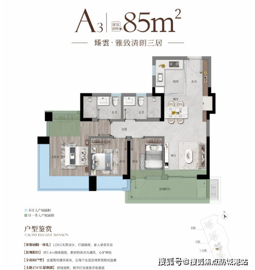 臻雲·建面约85㎡雅致清朗三居,主打刚需上车,适配年轻小家庭或单身贵族。该户型使用率接近100%,空间利用率极高,无浪费面积;阔绰3开间设计,全南向布局,采光通风俱佳,让阳光与清风轻松入户,提升居住舒适度;LDKG创变宽厅设计,将客厅、餐厅、厨房、阳台融为一体,空间通透开阔,既方便家人日常互动,又能提升空间视觉效果;270°无边观景主卧,自带飘窗,可俯瞰社区园林景观,兼具实用性与观赏性,为业主提供专属私密空间。