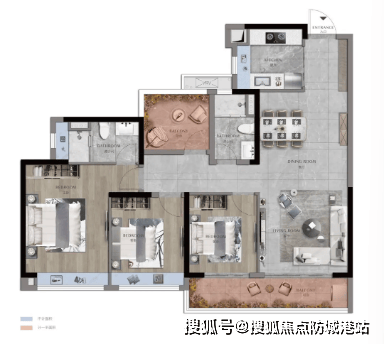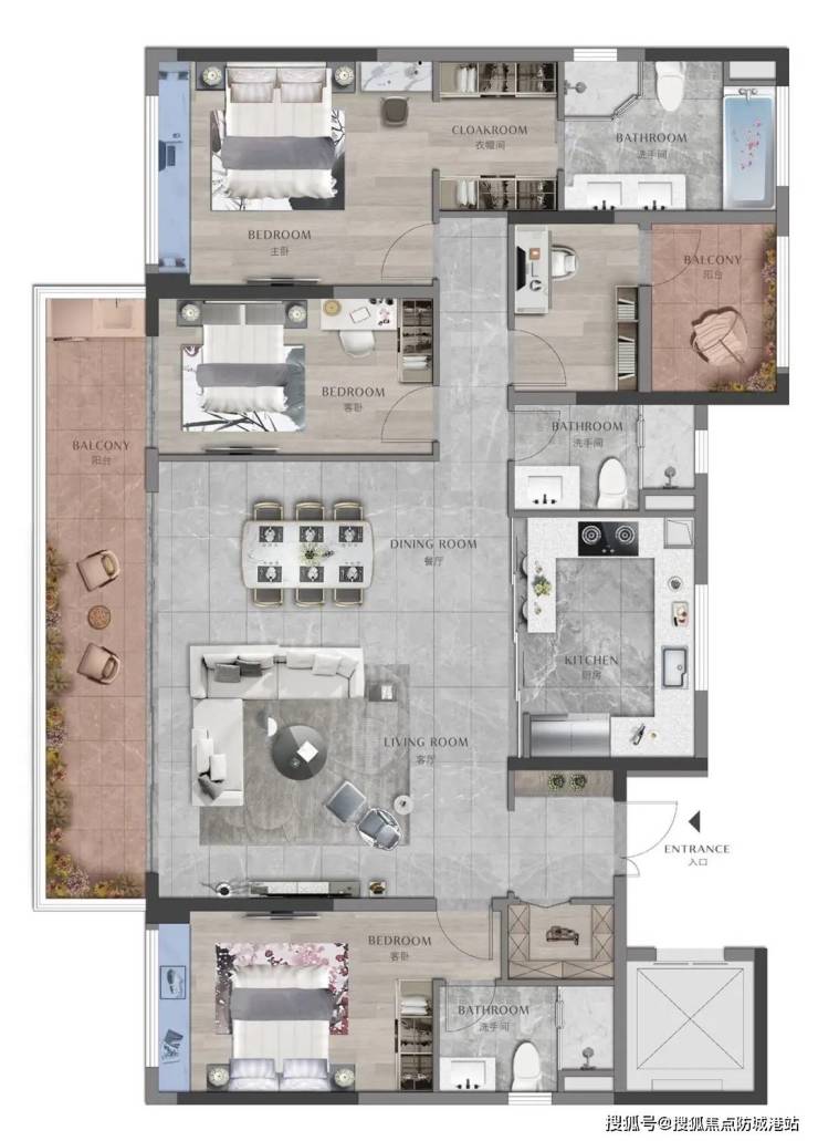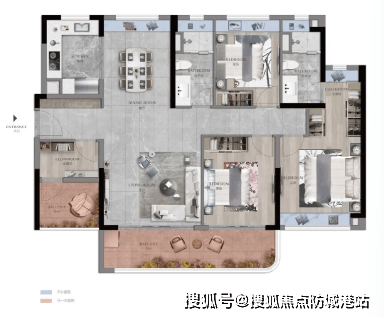 188㎡四房两厅三卫:独立电梯入户,约10米超长阳台无遮挡望江,中西双厨房设计,主卧步入式衣帽间;