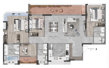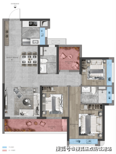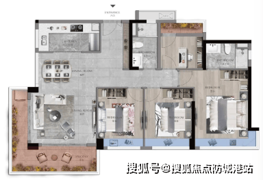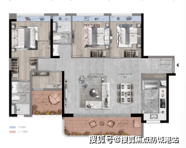 135㎡四房两厅两卫:LDK一体化方厅,南北通透,约7米宽景阳台收藏中轴绿廊,主卧270°飘窗瞰江;