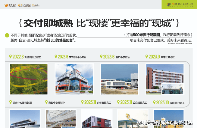 越秀白云星汇城配建了完整的12年教育体系,包括2所幼儿园、1所小学和1所初中。小学和中学由白云区金广实验学校具体管理,这所学校连续6年中考成绩名列前茅,为孩子的教育提供了有力保障。同时,社区内的金广小学已经封顶,金广中学也已经开始动工,进一步提升了项目的教育吸引力。