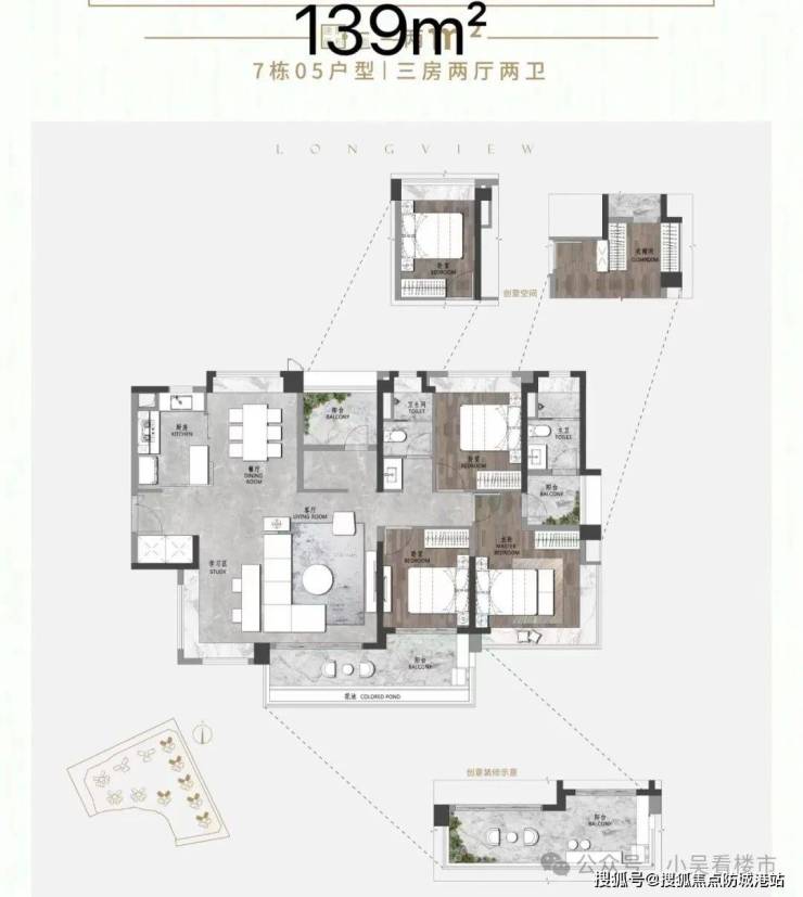 建面140平四房,5.9米客厅开间,阳台进深2.2米,长6.7米,整个户型南北对流,主卧约30平,270度L型景观飘窗,总价720万起。