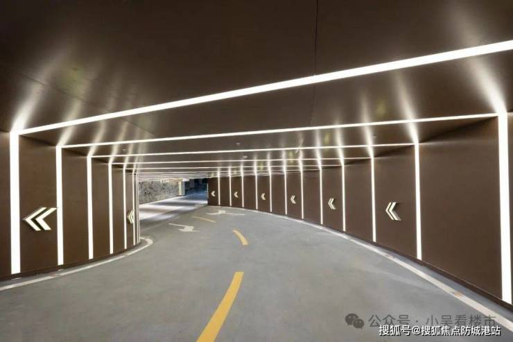车库入口,设计师选择用铝板饰面,并用层层递进的竖向线性灯提示过弯。