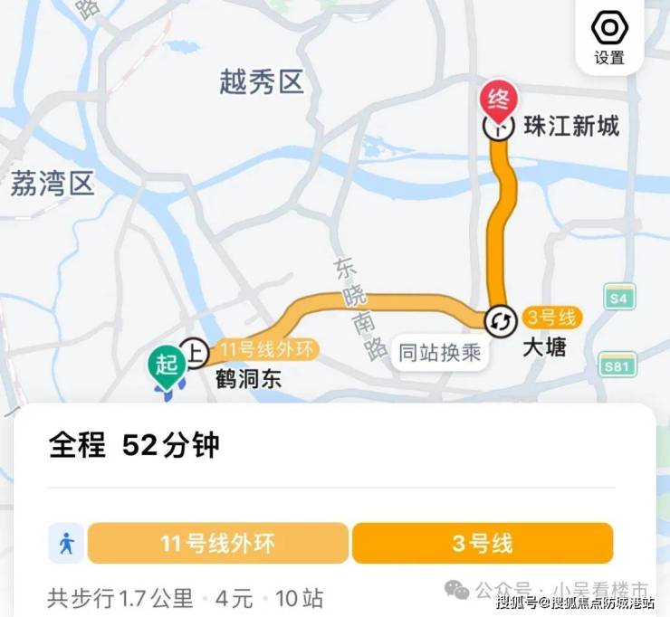地铁去往珠江新城:步行至鹤洞东站,乘坐地铁11号线到大塘换乘3号线,再到珠江新城,全程10个站,耗时52分钟左右。