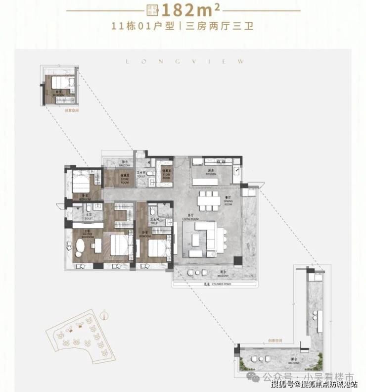 建面177-182平四房三卫,三开间朝南,开间达到6米,餐客厅面积达到50平,16米长的270度转角大阳台,大主卧带10米转角飘窗,总价960万起。