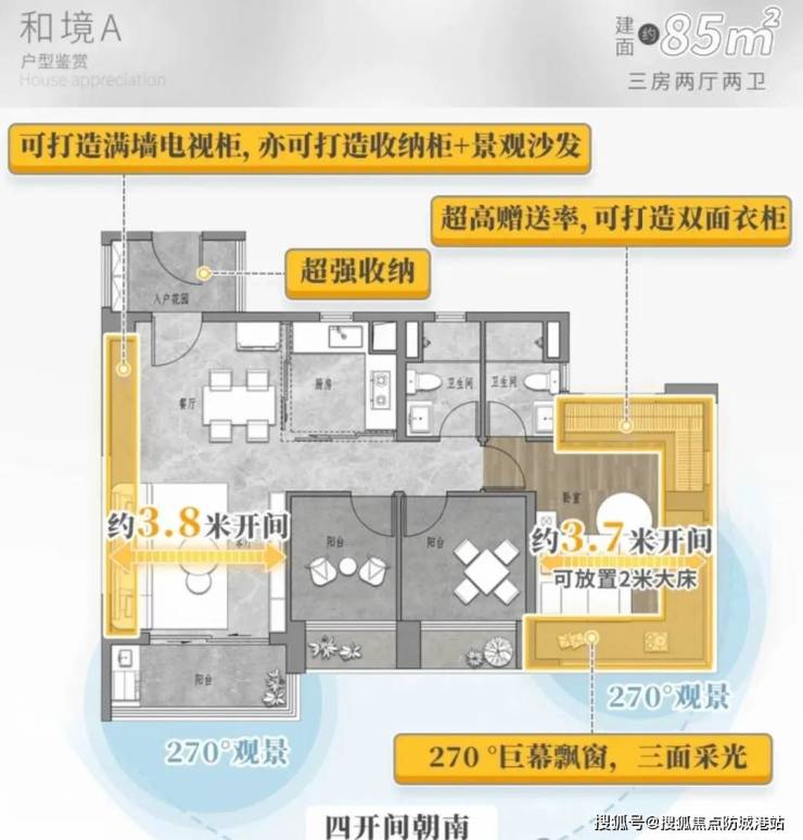 下面是85A的户型,阳台、卧室全南向三房,优越采光,四季阳光为伴